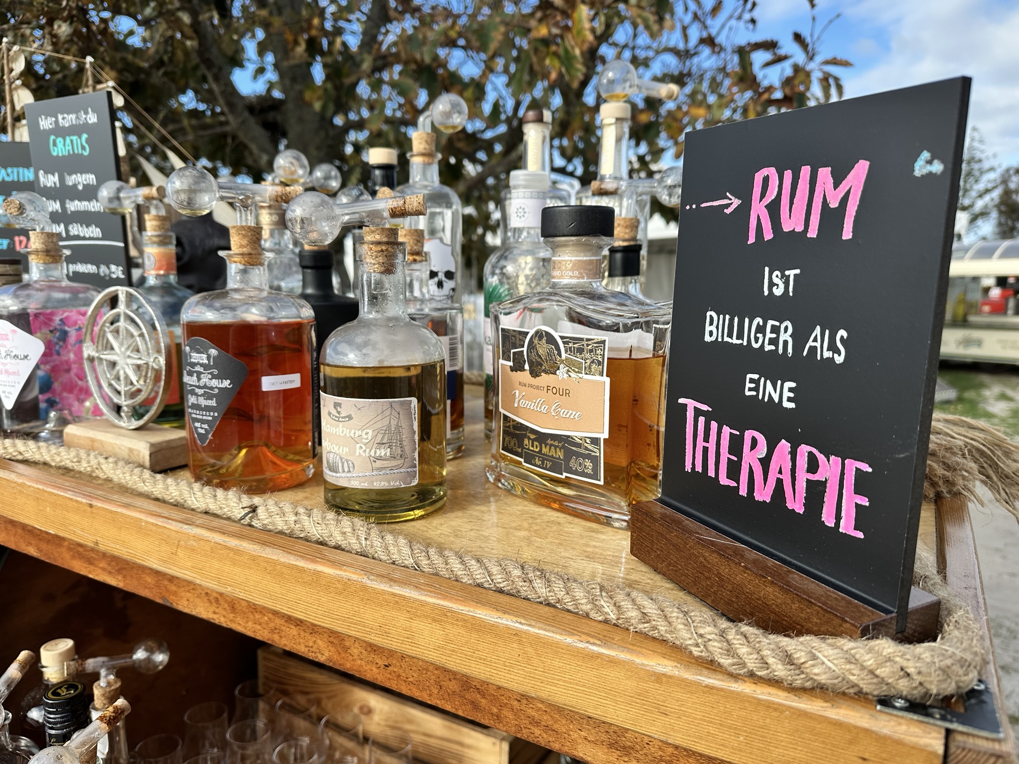 Der Cap. hat nicht nur feinen Rum, sondern auch jede Menge Anekdoten, sein loses Mundwerk und freche Bemerkungen dabei.